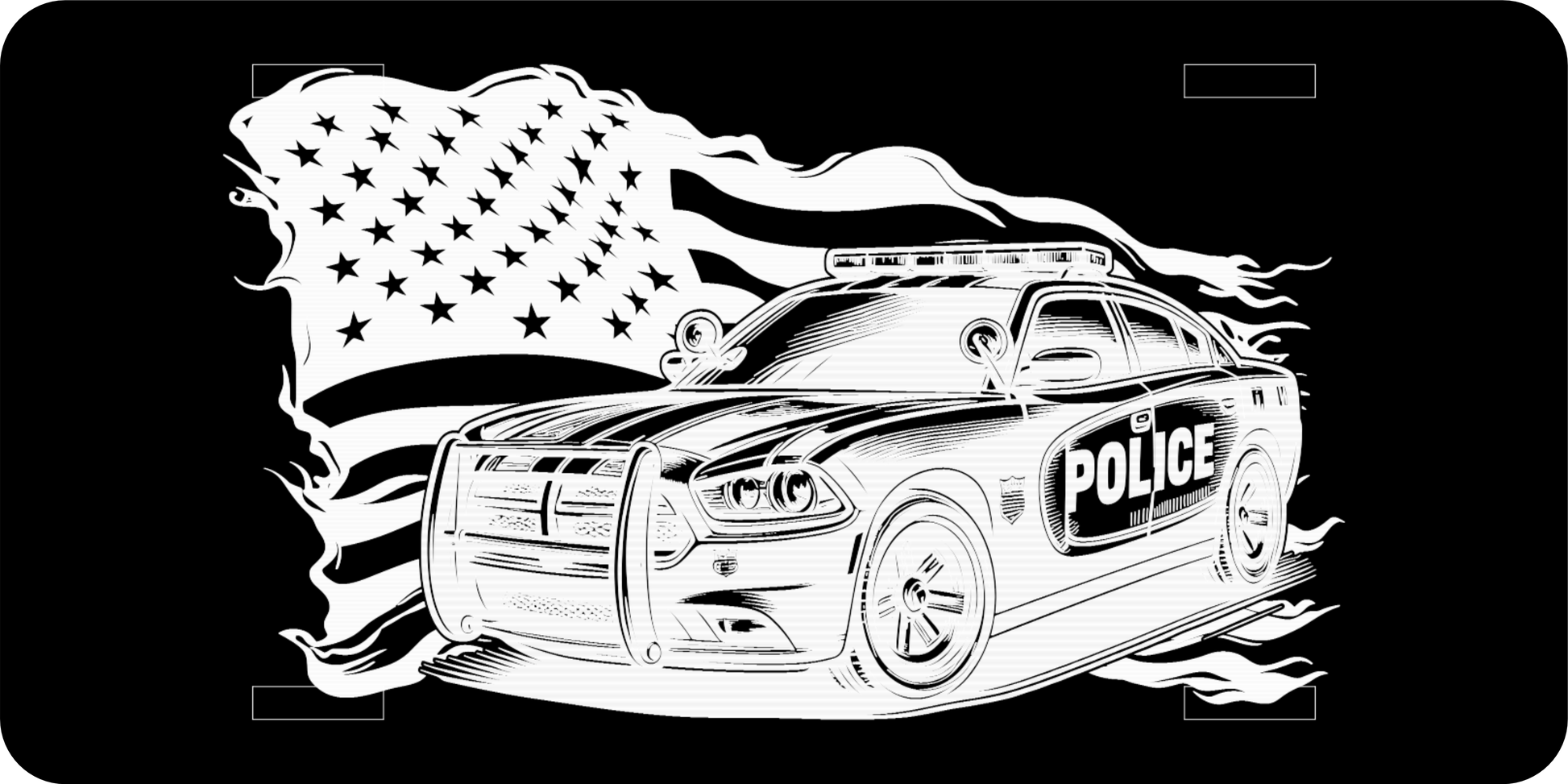 Expertly designed for displaying your pride and support for the dedicated men and women of law enforcement, our American Flag Police Car is captured in stunning detail against a backdrop of the American flag. Measuring 12" wide and 6" tall, these aluminum tags are constructed with .040 thick anodized aluminum and rounded corners for a durable and long-lasting finish. Plus, the pre-punched holes make for easy mounting options.