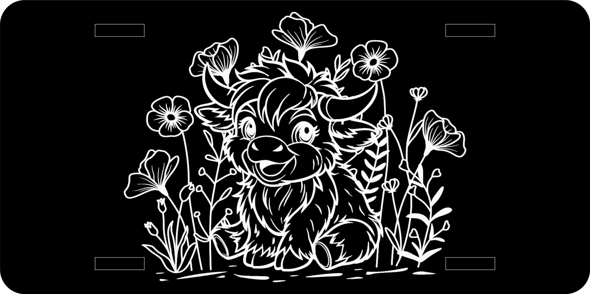 These 12" Wide X 6" Tall Aluminum tags are crafted from .040 thick anodized aluminum with rounded corners, perfect for mounting as desired. Featuring a Highland Cow resting in a lush bed of flowers, these tags add a touch of elegance to any vehilce.